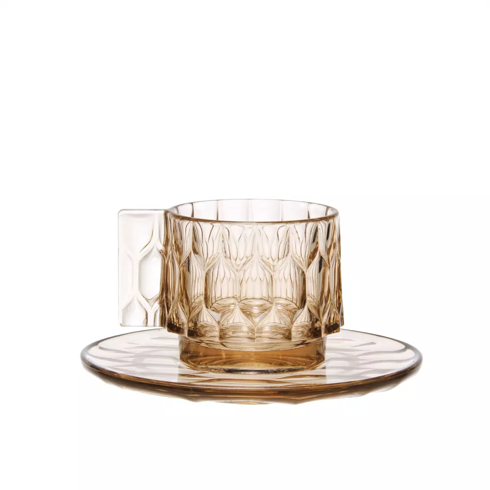 TAZZA CAFFE CON PIATTINO, JELLIES FAMILY 1582 - KARTELL Questa linea di piatti, vassoi, bicchieri, ciotole e caraffe offre una vasta selezione di prodotti realizzati in brillante PMMA colorato e trasparente. Ciò che rende questa linea unica è che ogni modello presenta un motivo diverso, ispirato alla natura e all'organicità, che richiama gli stampi tradizionali utilizzati per preparare gelatine nelle cucine. Questi motivi mettono in evidenza la temporalità e la varietà che caratterizza ogni fase del pasto, dalla portata iniziale all'ultima. I delicati colori trasparenti, morbidi e facilmente abbinabili, consentono di allestire tavole variopinte: creative e originali oppure più classiche e monocromatiche. Materiale PMMA COLORATO IN MASSA SCOPRI TUTTA LA COLLEZIONE: Jellies Family Kartell