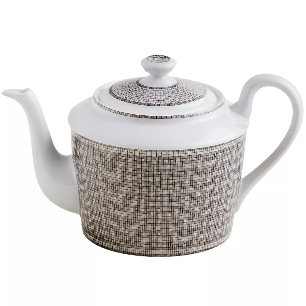 La teiera Mosaique au 24 di Hermès è un capolavoro di eleganza e arte della tavola, pensata per servire il te con stile impeccabile. Realizzata in porcellana con decorazioni serigrafate e applicate a mano, è impreziosita da cabochon in platino o oro che esaltano i raffinati motivi geometrici iconici della collezione.