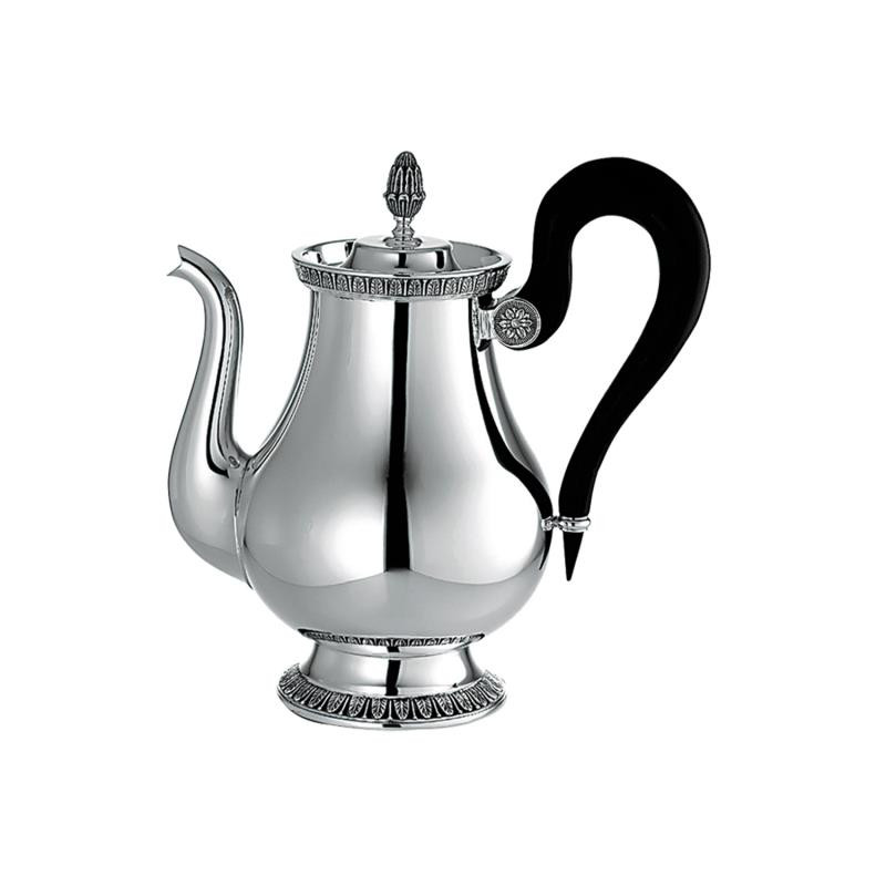 Teiera in argento placcato Christofle Malmaison Questa teiera Malmaison placcata in argento, con un'incredibile maniglia in legno di ebano, aggiunge raffinatezza ed eleganza a qualsiasi tè pomeridiano o brunch. Soprattutto quando è abbinato alla brocca e alla zuccheriera. Uno dei modelli più storici di Christofle, Malmaison rappresenta lo stile Impero, con il suo fregio di palme delicate e foglie di loto e design simmetrico. Il nome è un cenno al Chateau de la Malmaison, una residenza parigina preferita di Napoleone Bonaparte e dell'imperatrice Giuseppina. È anche l'unica linea che include un servizio di caviale. Malmaison, uno dei modelli più storici di Christofle, è in stile Impero. Il fregio di delicate palme e foglie di loto è tipico di questo stile. MATERIALE • Argento placcato DIMENSIONI • 8 CUPS