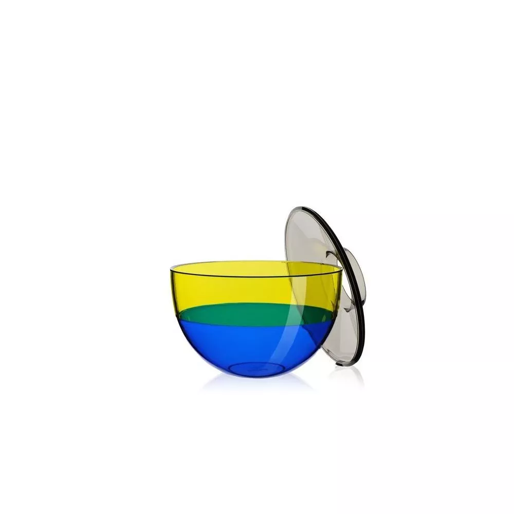 VASO CONTENITORE SHIBUYA, 1221 - KARTELL Con i vasi Shibuya, Christophe Pillet introduce un'innovativa sperimentazione di Kartell, che mira a conferire alla plastica un aspetto "prezioso" simile al vetro soffiato di Murano, con una consistenza ricca e solida. Questi vasi presentano un coperchio forato, che, una volta rimosso, consente loro di trasformarsi facilmente da oggetti puramente decorativi in accessori per la tavola. Oltre alla loro polifunzionalità, ciò che rende questo progetto particolare è la presenza di due fasce colorate sul vaso, senza alcuna interruzione nella superficie del materiale, che assicurano una perfetta tenuta dell'acqua. Il colore gioca un ruolo fondamentale in questo progetto, grazie alla sua intensità, profondità e alla consistenza del materiale plastico, conferendo un valore speciale a questo oggetto nonostante sia prodotto su scala industriale e venduto a un prezzo accessibile. Materiale: PMMA trasparente o colorato in massa Dimensioni Altezza: 22 cm Diametro: 27 cm Peso unitario: 0.072 kg