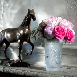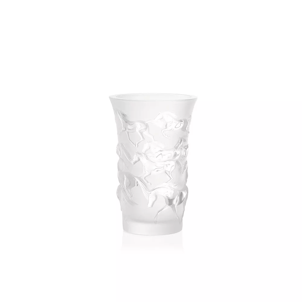 VASO MUSTANG TRASPATENTE, 1257500 - LALIQUE Un branco di cavalli selvaggi galoppa su questo vaso, le loro criniere fluenti rivelano la vera estensione della loro libertà. Cristallo trasparente Dimensioni: H 17.80 cm x D 11.90 cm Peso: 0.40 kg Realizzato a mano in Francia Sku: 1257500