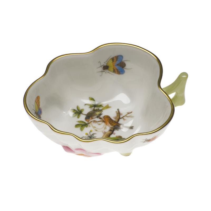 Rothschild Birds, uno dei decori Herend più conosciuti, prende il nome dall'importante famiglia baronale dei Rothschild ed ha come protagonisti due uccelli (sono raffigurate dodici diverse specie di uccelli appoggiati ad un ramo stilizzato). Il decoro si ispira a un racconto del XIX secolo sulla baronessa Rothschild, che perse dei preziosi di perle nel giardino della sua residenza viennese. Venne ritrovata diversi giorni dopo dal suo giardiniere che notò due uccellini giocarci su di un albero. Zuccheriera a foglia 10,5 x 8,5 cm h 4 cm Materiale: porcellana con decorazioni in oro Codice: 492 Si consiglia il lavaggio a mano. Mai mettere nel microonde un articolo con finiture oro o platino.