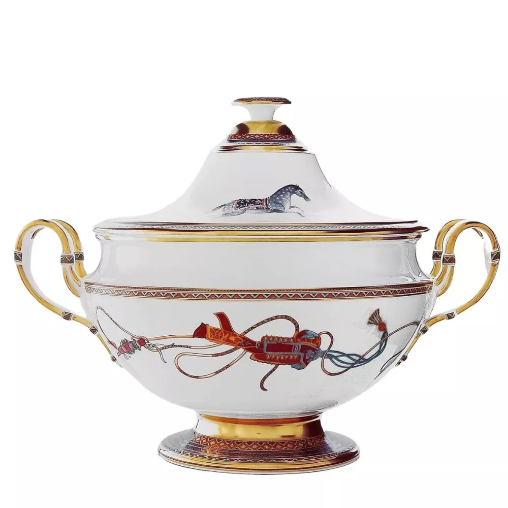 Hermes Cheval D'Orient Zuppiera Codice: 9829P In una steppa bianca di neve, tra ciuffi d'erba primaverili, galoppano dei cavalli. La loro cavalcata silenziosa proviene da un'epoca che ignora il tempo.Galoppano su una coltre punteggiata di porpora, azzurro intenso e oro, provenienti da quell'Oriente di sogno illustrato dalle miniature persiane. Capacità: 430 cl Materiale: porcellana Per tutti i prodotti Hermés non disponibili al momento dell'acquisto, si prega di considerare tempistiche di consegna dai 6 fino ad oltre i 12 mesi.