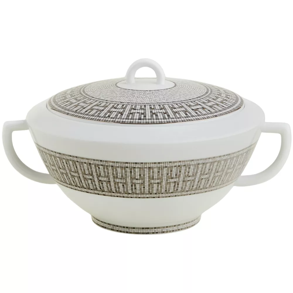 La zuppiera Mosaique au 24 di Hermès è una raffinata espressione di arte della tavola e design iconico. Realizzata in porcellana con decorazioni serigrafate e applicate a mano, si distingue per i suoi motivi geometrici che richiamano i codici estetici della storica boutique parigina al numero 24 di rue du Faubourg Saint Honore.